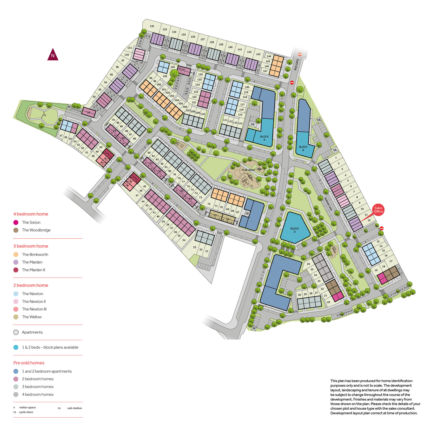 The site plan which can be found on this page, has been produced for home identification purposes only and is not to scale. The development layout, landscaping and tenure of all dwellings may be subject to change throughout the course of the development. Finishes and materials may vary from those shown on the plan. Please check the details of your chosen plot and house type with the sales consultant. Development layout plan correct at time of production.