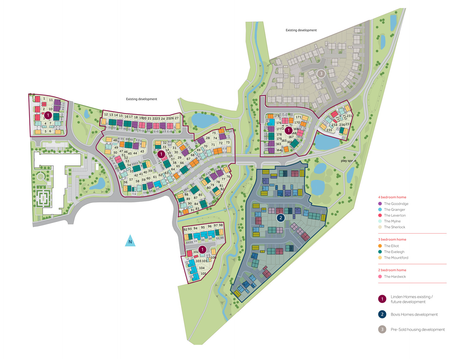 The site plan which can be found on this page, has been produced for home identification purposes only and is not to scale. The development layout, landscaping and tenure of all dwellings may be subject to change throughout the course of the development. Finishes and materials may vary from those shown on the plan. Please check the details of your chosen plot and house type with the sales consultant. Development layout plan correct at time of production.