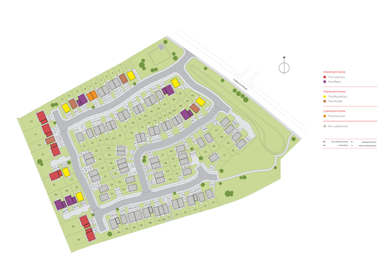 The site plan which can be found on this page, has been produced for home identification purposes only and is not to scale. The development layout, landscaping and tenure of all dwellings may be subject to change throughout the course of the development. Finishes and materials may vary from those shown on the plan. Please check the details of your chosen plot and house type with the sales consultant. Development layout plan correct at time of production.