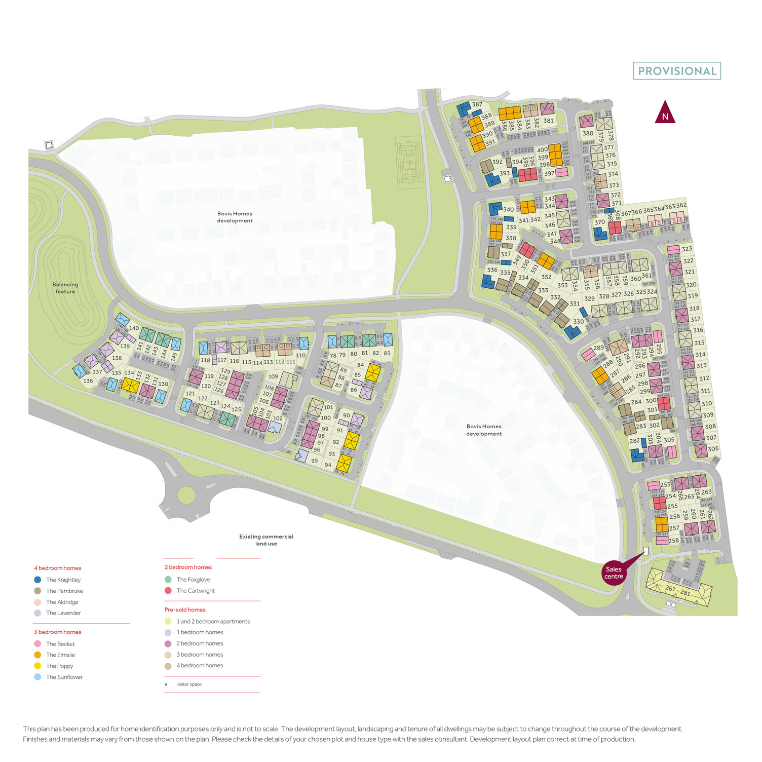 The site plan which can be found on this page, has been produced for home identification purposes only and is not to scale. The development layout, landscaping and tenure of all dwellings may be subject to change throughout the course of the development. Finishes and materials may vary from those shown on the plan. Please check the details of your chosen plot and house type with the sales consultant. Development layout plan correct at time of production.