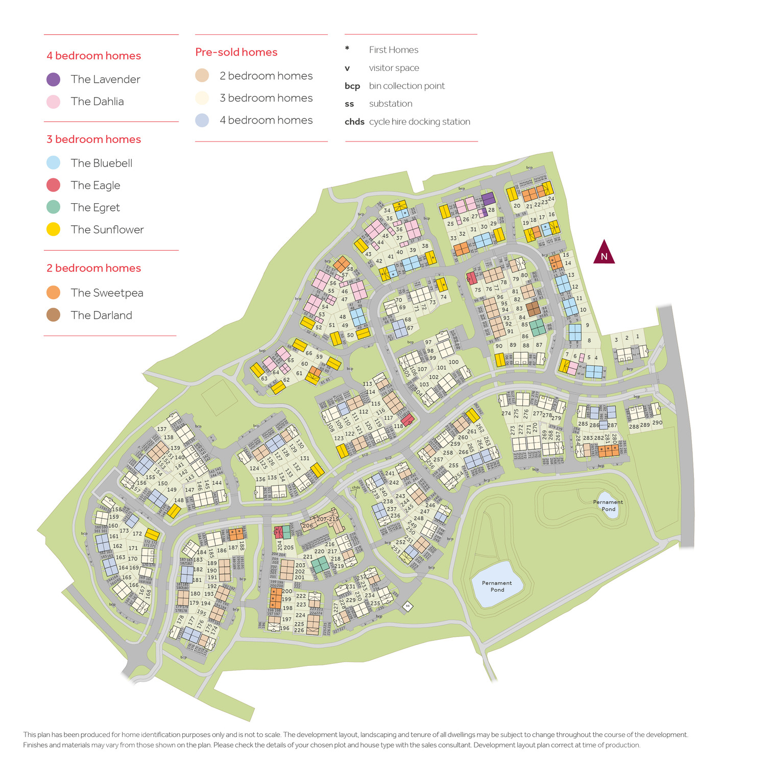 View Opening HoursThe site plan which can be found on this page, has been produced for home identification purposes only and is not to scale. The development layout, landscaping and tenure of all dwellings may be subject to change throughout the course of the development. Finishes and materials may vary from those shown on the plan. Please check the details of your chosen plot and house type with the sales consultant. Development layout plan correct at time of production.