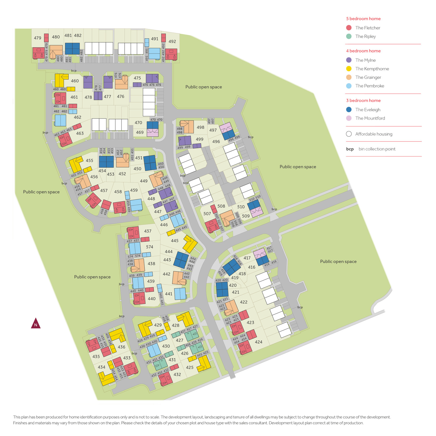View Opening HoursThe site plan which can be found on this page, has been produced for home identification purposes only and is not to scale. The development layout, landscaping and tenure of all dwellings may be subject to change throughout the course of the development. Finishes and materials may vary from those shown on the plan. Please check the details of your chosen plot and house type with the sales consultant. Development layout plan correct at time of production.