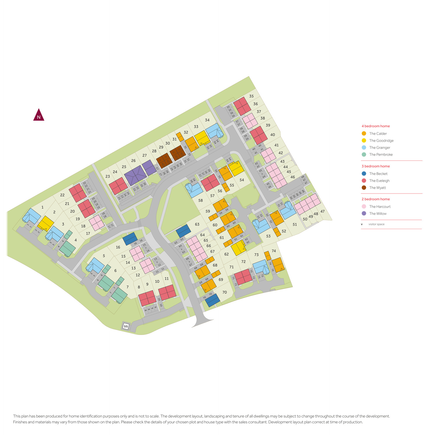 The site plan which can be found on this page, has been produced for home identification purposes only and is not to scale. The development layout, landscaping and tenure of all dwellings may be subject to change throughout the course of the development. Finishes and materials may vary from those shown on the plan. Please check the details of your chosen plot and house type with the sales consultant. Development layout plan correct at time of production.